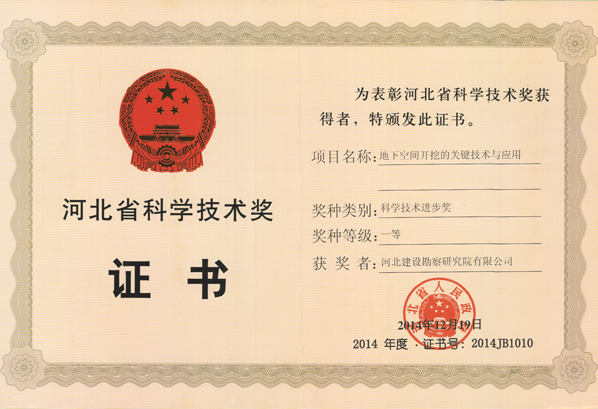 2015年2月26日,省委、省政府在石家莊召開全省科技創(chuàng)新暨科學(xué)技術(shù)獎勵大會,省委書記、省人大常委會主任周本順,省委副書記、省長張慶偉出席會議并講話。會上,副省長許寧宣讀了省政府關(guān)于2014年度河北省科學(xué)技術(shù)獎勵的決定,公布了獲獎項目(人員)名單。我公司申報的項目“地下空間開挖的關(guān)鍵技術(shù)與應(yīng)用”榮獲2014年度河北省科學(xué)技術(shù)進(jìn)步獎一等獎。