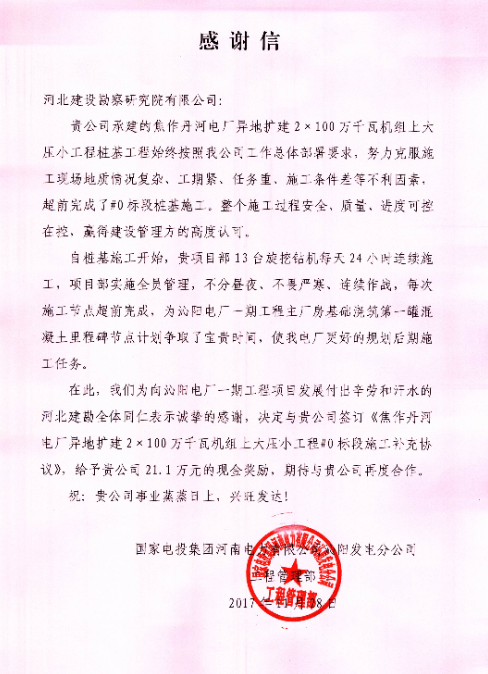 我公司承建的焦作丹河電廠異地擴建2×100萬千瓦機組上大壓小工程樁基工程,始終按照業(yè)主工作總體部署要求,努力克服施工現(xiàn)場地質(zhì)情況復(fù)雜、工期緊、任務(wù)重、施工條件差等不利因素,超前完成了#0標(biāo)段樁基施工,整個施工過程安全、質(zhì)量、進度可控在控,贏得了建設(shè)管理方的高度認可。11月28日,國家電投集團河南電力有限公司沁陽發(fā)電分公司工程管理部發(fā)來感謝信,對我公司項目部員工表示感謝,并期待與我公司的再度合作。