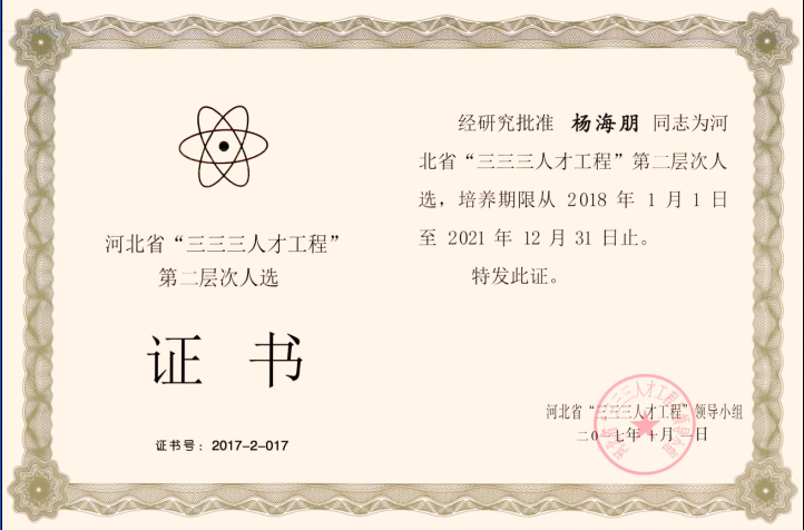 經(jīng)公司推薦,河北省人力資源和社會保障廳組織評審,河北省“三三三人才工程”領(lǐng)導(dǎo)小組批準(zhǔn)、公司楊海朋榮獲河北省“三三三人才工程”第二層次人選。
