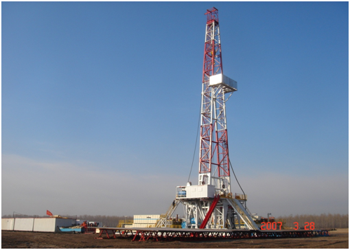 該型頁巖氣鉆機,包括底座、井架、動力裝置、傳動機構、聯動機構、轉盤、絞車、游車、高壓管路、泥漿泵以及氣控系統。其優點在于:通過采用密閉水冷式絞車,滾筒摩擦轂冷卻采用離心泵強制循環水冷卻方式,主滾筒摩擦轂上帶有水套和水循環管線;動力裝置采用三臺柴油發動機,同時三臺柴油發動機之間設置聯動機構,增大功率;配備兩臺3NB 1300C泥漿泵,能滿足噴射鉆井的需要。