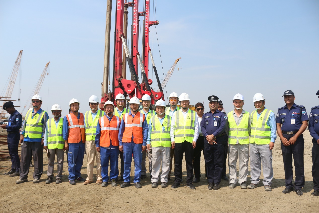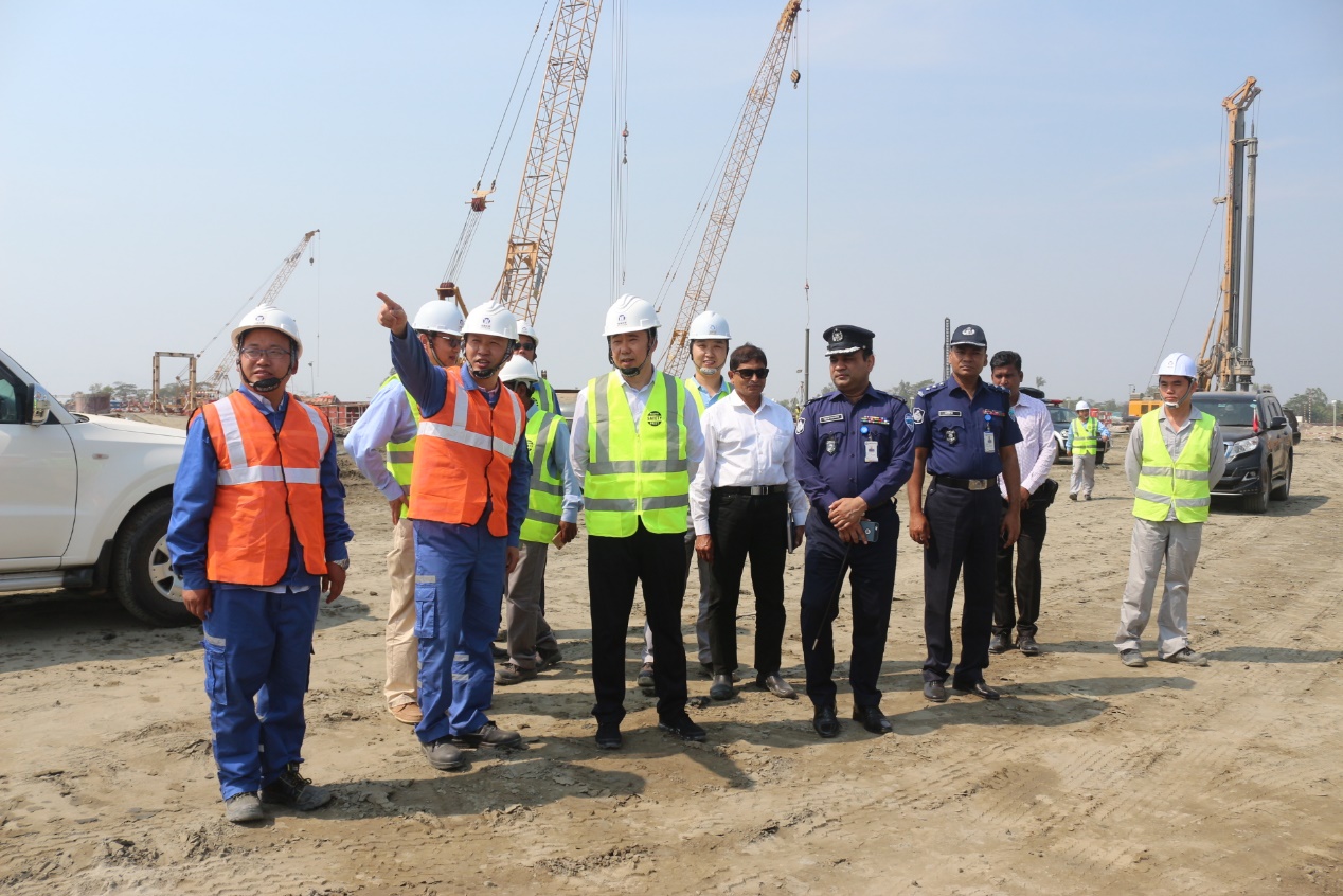 2019年2月23日,駐孟加拉國特命全權大使張佐蒞臨我公司孟加拉吉大港艾薩拉姆超超臨界燃煤機組樁基工程施工現場進行視察。公司駐孟加拉辦事處主任李福來、項目經理丁偉和EPC總包單位山東電建三公司部分員工以及吉大港市警察局最高警司全程陪同。
