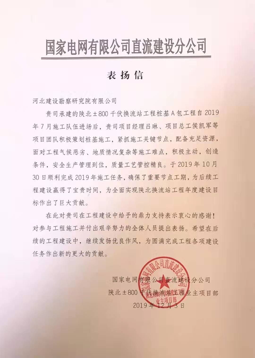 另有陜北換流站項目部也收到國家電網直流建設分公司的感謝信,該項目自2019年7月進場后,在項目經理呂琳、項目總工侯凱軍等精心組織和艱苦努力下,順利完成施工任務,確保了重要節點工期,為后續工程建設贏得了寶貴時間,為全面實現陜北換流站工程年度建設目標作出巨大貢獻,受到業主的充分肯定和高度表揚。