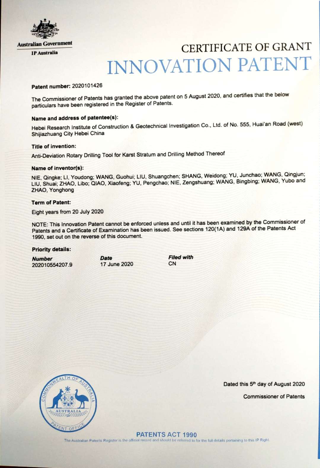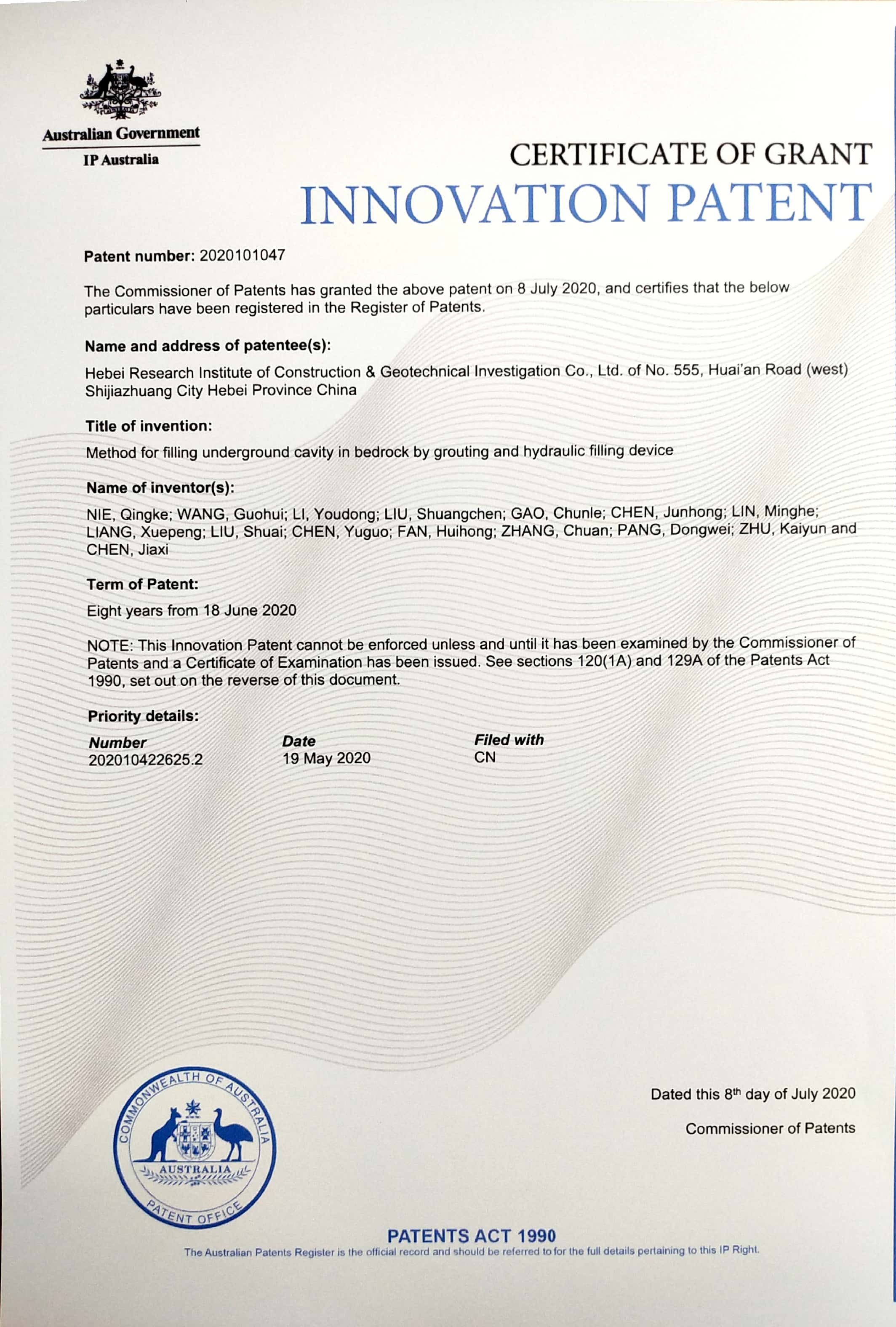 近日,由我公司開發完成的兩項新技術:“一種填料注漿充填基巖地下空洞的方法以及一種水力充填裝置”、“一種巖溶底層旋挖鉆孔防斜鉆具及鉆孔方法”,被授予澳大利亞專利權。這是公司第一次申請國際專利,申請成功提升了公司無形資產價值與品牌價值,體現了我公司較強的技術創新能力及企業綜合實力。