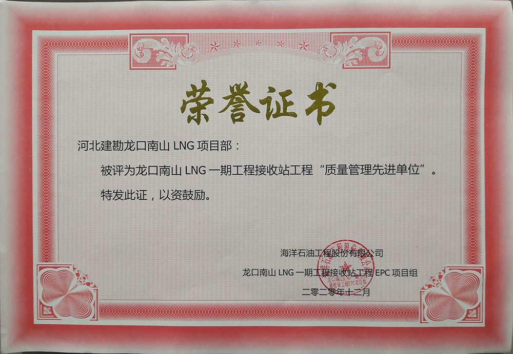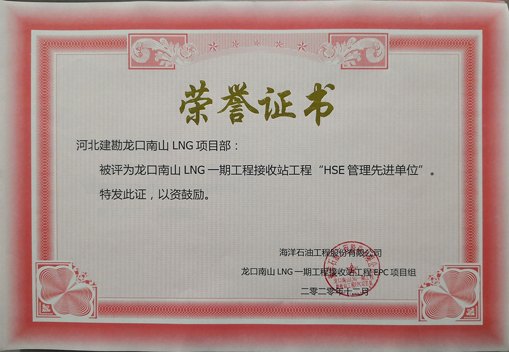 2020年12月,公司收到海洋石油工程股份有限公司發(fā)來(lái)的表?yè)P(yáng)信,對(duì)我公司在龍口南山LNG一期工程接收站工程EPC項(xiàng)目?jī)?chǔ)罐樁基工程標(biāo)段一施工過(guò)程中,面對(duì)施工現(xiàn)場(chǎng)地質(zhì)情況復(fù)雜、新工藝、施工難度大、氣候炎熱多雨、新冠疫情、人材機(jī)緊缺等不利因素,按合同要求順利完成了一標(biāo)段1#和2#儲(chǔ)罐3497根振沖碎石樁和720根樁柱一體化灌注樁全部施工任務(wù),給予了高度認(rèn)可和好評(píng),并表示感謝!我公司被評(píng)為“質(zhì)量管理先進(jìn)單位”和“HSE管理先進(jìn)單位”并頒發(fā)了榮譽(yù)證書(shū),同時(shí)對(duì)先進(jìn)個(gè)人頒發(fā)了“優(yōu)秀項(xiàng)目管理者”、 “HSE管理先進(jìn)個(gè)人”、 “質(zhì)量管理先進(jìn)個(gè)人”榮譽(yù)證書(shū)。