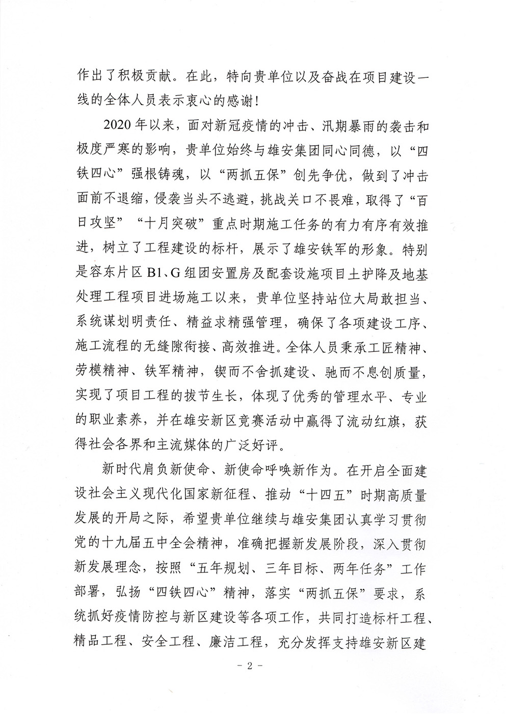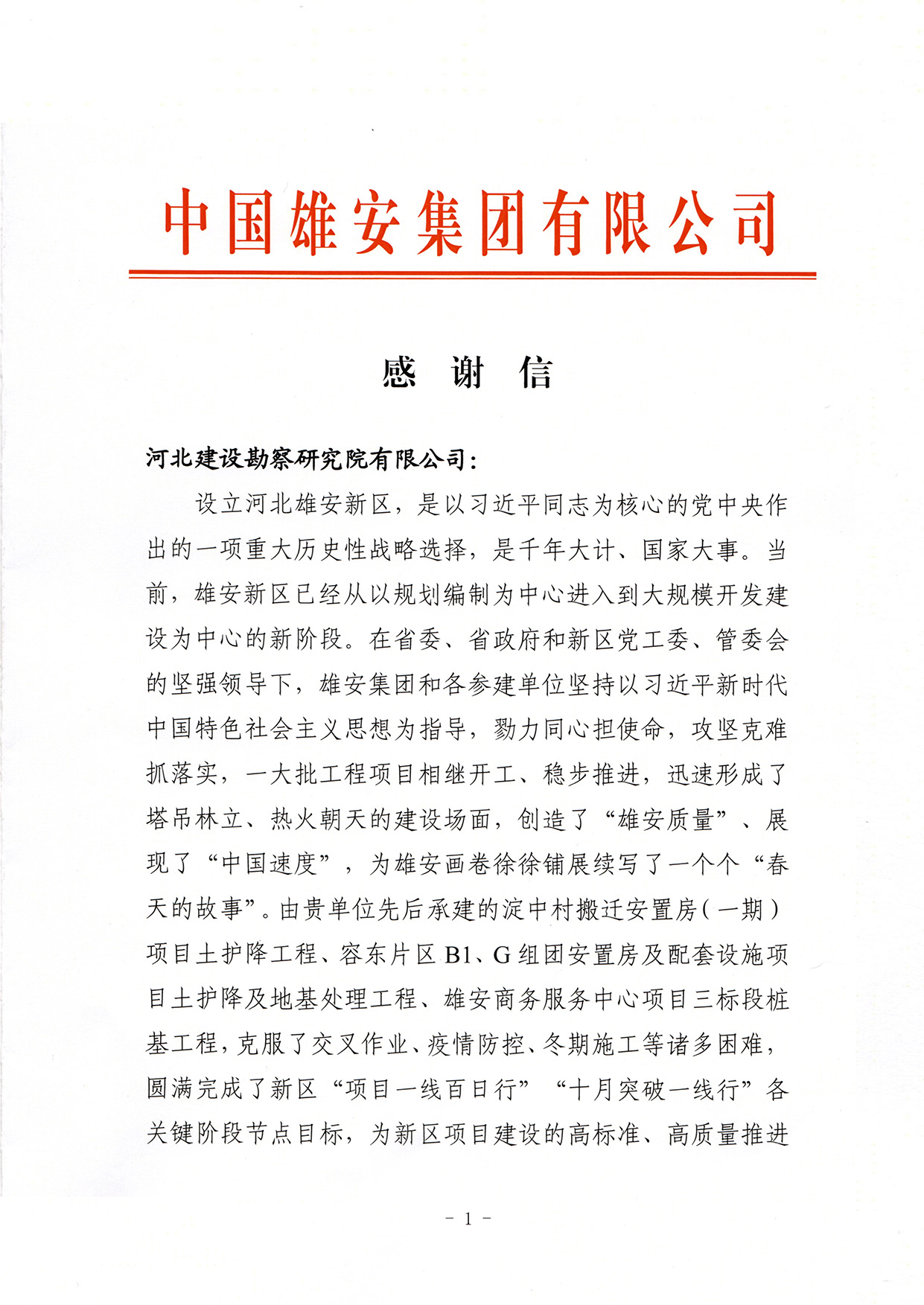 近日,公司收到中國雄安集團有限公司發來的感謝信。感謝我公司先后承建的淀中村搬遷安置房(一期)項目土護降工程、容東片區B1、G組團安置房及配套設施項目土護降及地基處理工程、雄安商務服務中心項目三標段樁基工程,在施工過程中,堅持站位大局敢擔當、系統謀劃明責任、精益求精強管理,確保了各項建設工序、施工流程的無縫銜接、高效推進。全體人員秉承工匠精神、勞模精神、鐵軍精神,鍥而不舍抓建設、馳而不息創質量,實現了項目工程的拔節生長,體現了優秀的管理水平、專業的職業素養,并在雄安新區競賽活動中贏得了流動紅旗,獲得社會各界和主流媒體的廣泛好評。