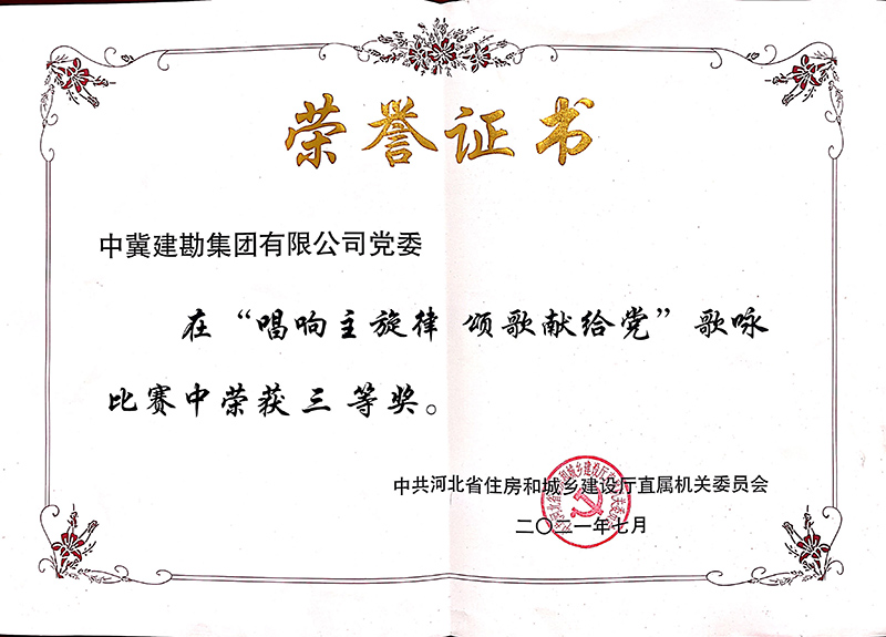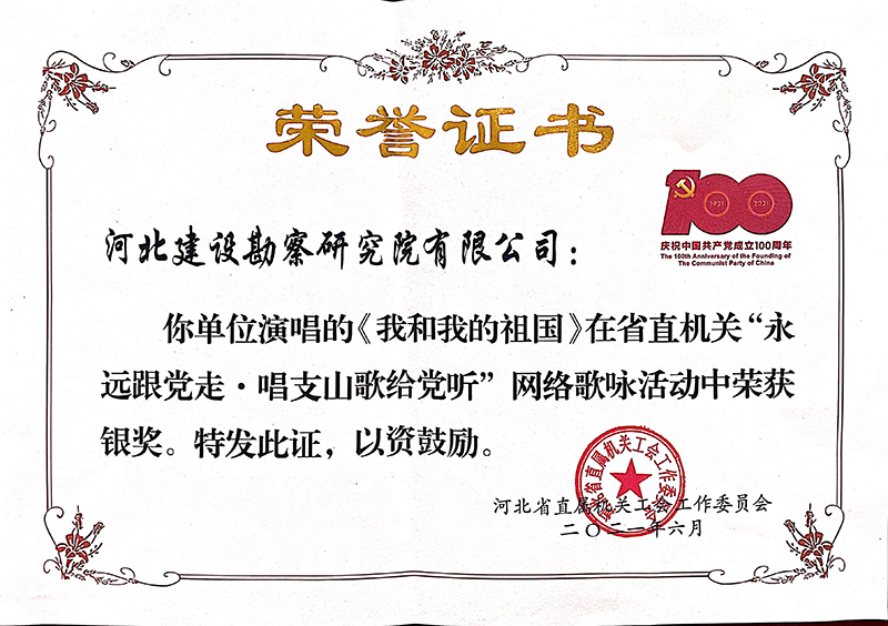 為慶祝中國共產黨建黨100周年,謳歌建黨百年的光輝歷程和豐功偉績,今年以來,公司開展了建黨百年系列慶祝活動,并積極響應上級黨組織工作安排,先后參加了由省直工會組織開展的“永遠跟黨走•唱支山歌給黨聽”網絡歌詠活動和省住房和城鄉建設廳舉辦的“唱響主旋律 頌歌獻給黨”歌詠比賽,用嘹亮的歌聲和飽含深情的演唱充分展示了中冀建勘人積極向上的精神風貌,并在比賽中取得優秀的成績。
