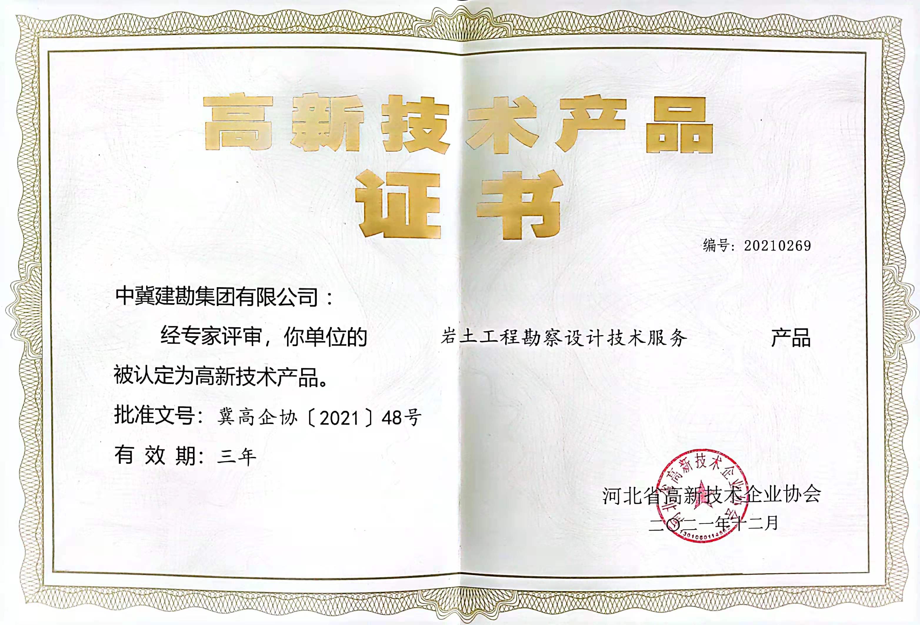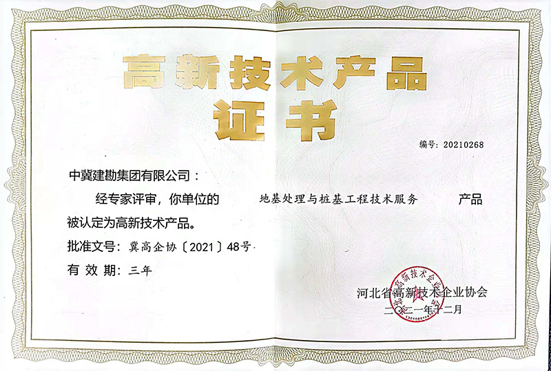 近日,河北省高新技術企業協會按照《河北省高新技術產品認定實施細則》要求,經組織專家評價、評審、認定,我公司兩項技術“地基處理與樁基工程技術服務”和“巖土工程勘察設計技術服務”兩項技術服務榮獲“高新技術產品”稱號。本次榮獲“高新技術產品”稱號,標志著擁有自主知識產權及核心技術的兩項服務產品得到了行業協會的認可,進一步提升了公司技術服務的品牌競效應以及品牌的競爭力、影響力。同時“高新技術產品”是高新技術企業認定的重要依據和加分項,為公司2022年高新技術企業的期滿重新認定打下了良好基礎。