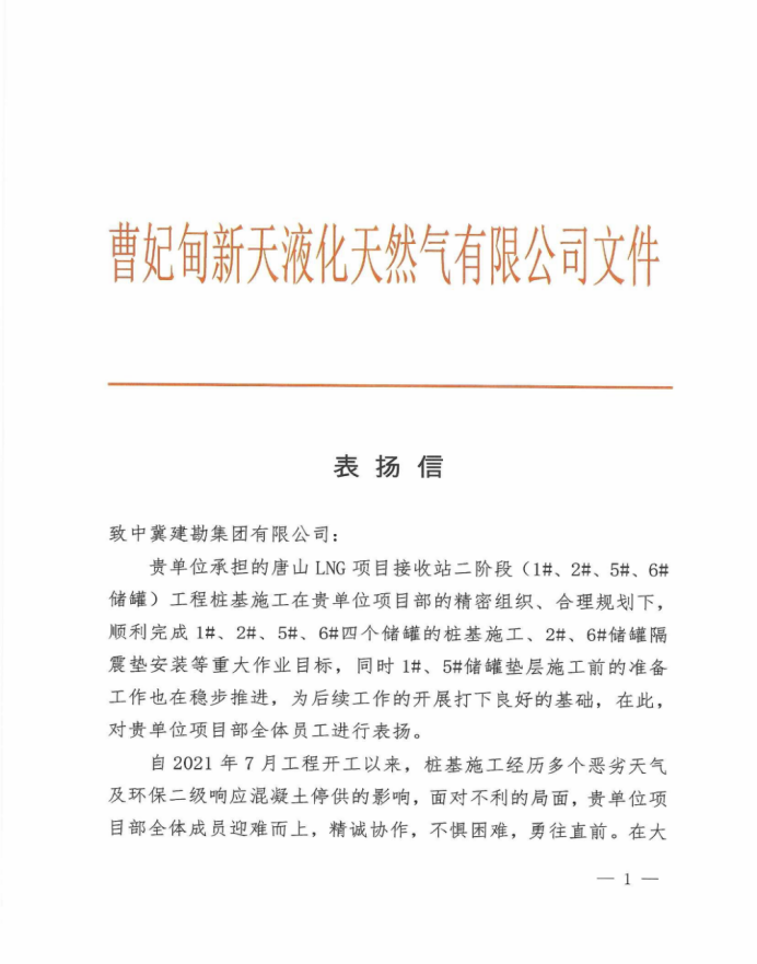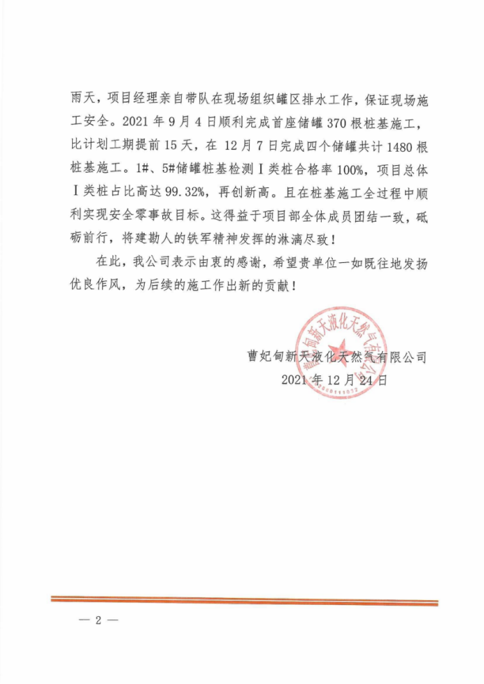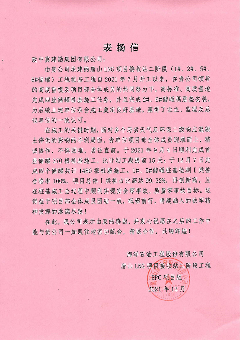 唐山LNG項(xiàng)目接收站二階段工程樁基工程項(xiàng)目部建設(shè)規(guī)模為4座20萬m³LNG儲(chǔ)罐,項(xiàng)目順利實(shí)現(xiàn)質(zhì)量零事故、安全零事故目標(biāo),贏得總包、監(jiān)理及業(yè)主的一致認(rèn)可與高度肯定。