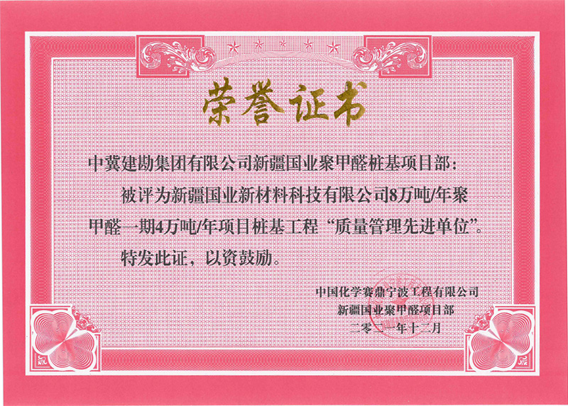 新疆國業新材料科技有限公司8萬噸/年聚甲醛一期4萬噸/年項目樁基工程榮獲“質量先進單位”。