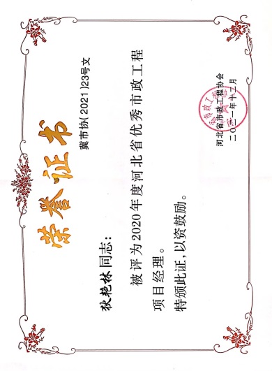 近日,由河北省市政工程協會評選,公司榮獲“2021年度河北省優秀市政施工企業”稱號;韓立君董事長榮獲“2021年度河北省市政行業優秀企業家”稱號;孫運青、狄艷林、高軍會、張海蛟四位同志榮獲“2020年度河北省優秀市政工程項目經理”稱號。