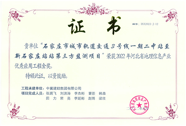 近日,由河北省地理信息產(chǎn)業(yè)協(xié)會評選,公司榮獲2020-2021年度河北省地理信息產(chǎn)業(yè)甲級測繪資質(zhì)“十佳單位”榮譽稱號,赫英超同志榮獲河北省地理信息產(chǎn)業(yè)“優(yōu)秀青年管理人才”稱號;同時石家莊市城市軌道交通3號線一期二中站至新石家莊站站第三方監(jiān)測項目榮獲“2022年度河北省地理信息產(chǎn)業(yè)優(yōu)秀應(yīng)用工程金獎”。