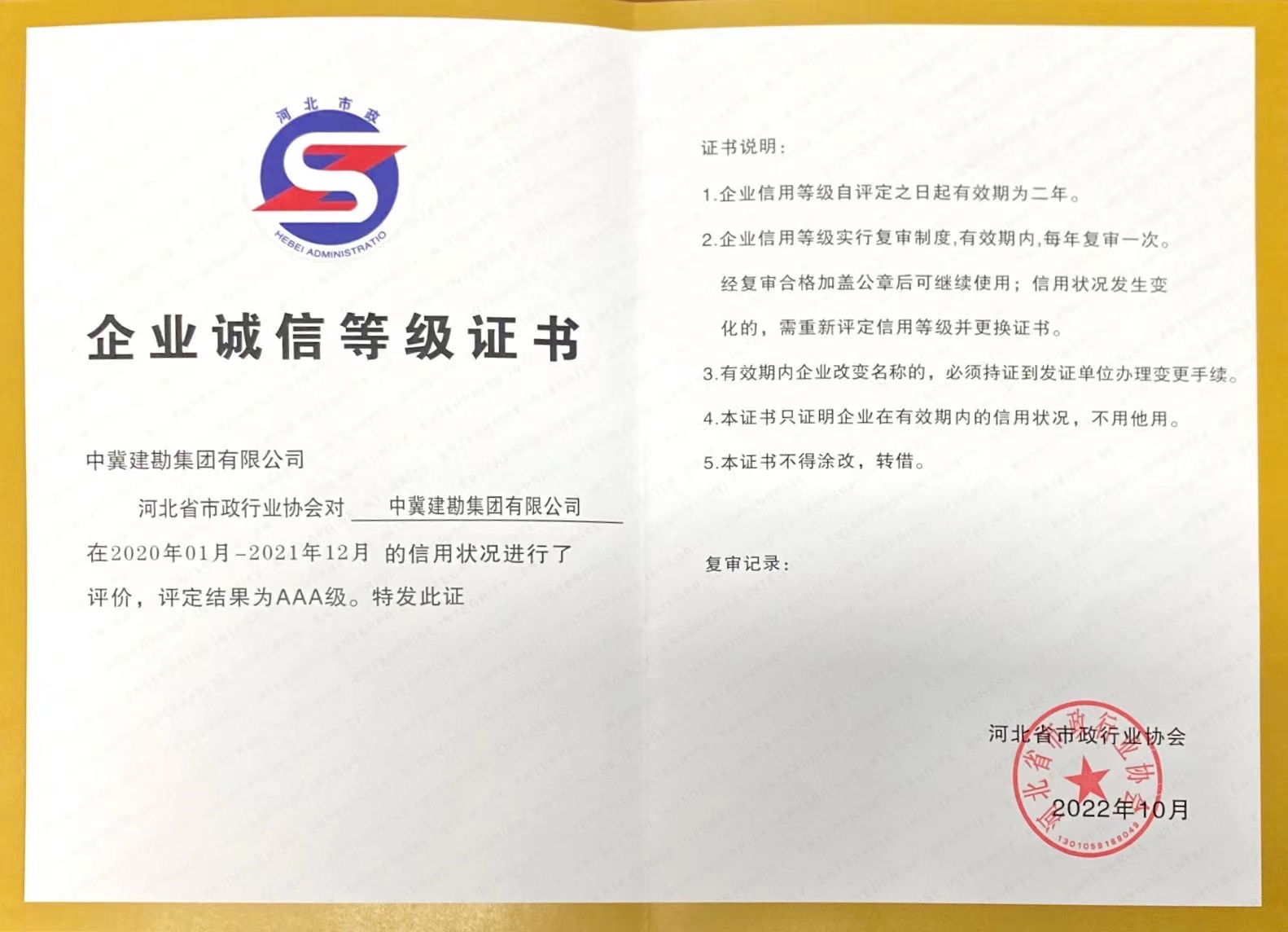 公司獲得“2021年度河北省市政行業AAA級誠信企業”榮譽稱號