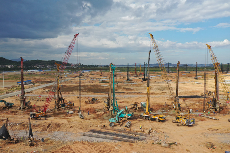 本工程自2021年5月15日開工, 2022年3月19日完工。完成Φ700mm鉆孔灌注樁700余根、Φ800mm鉆孔灌注樁4000余根、Φ1000mm鉆孔灌注樁100余根;PHC預應力管樁完成了PHC400mm共計200余根、PHC500mm共計6600余根、PHC600mm共計400余根,總計7400余根;施工勘察孔完成1500余根;基坑支護工程完成了支護樁Φ800mm鉆孔灌注樁200余根、Φ400mm降水井30余座、基坑錨索200余根、冠梁澆筑約370m、鋼結構腰梁支撐約370m、掛網噴錨約1650㎡、基坑土方開挖約40000m³。