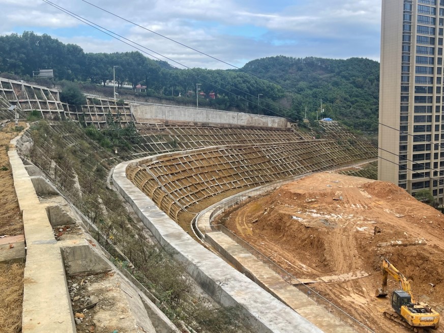 本工程位于浙江省永嘉縣甌北街道烏山路嶼塘山桃源陵園路段,本工程為大型地質(zhì)災害治理施工項目,主要施工內(nèi)容包括邊坡削坡、人工挖孔樁、鉆孔灌注樁、微型樁、錨桿格構(gòu)、毛石擋墻、板肋式擋墻、扶壁擋墻、盲溝、截排水溝、深部排水孔、錨索、護欄欄桿、樁間擋板、平臺硬化、噴坡綠化、路面修復等。