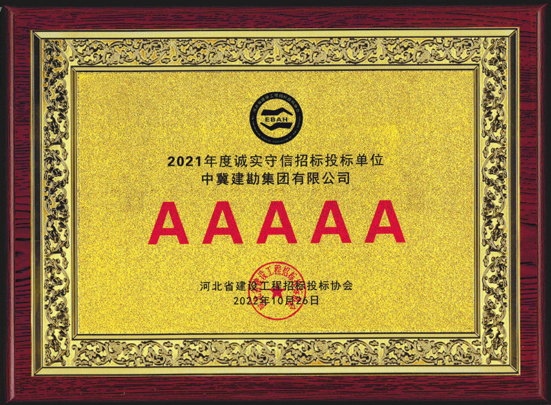 近日,我公司被河北省建設工程招標投標協(xié)會評為2021年度河北省建設工程招標投標誠實守信5A級施工企業(yè)。