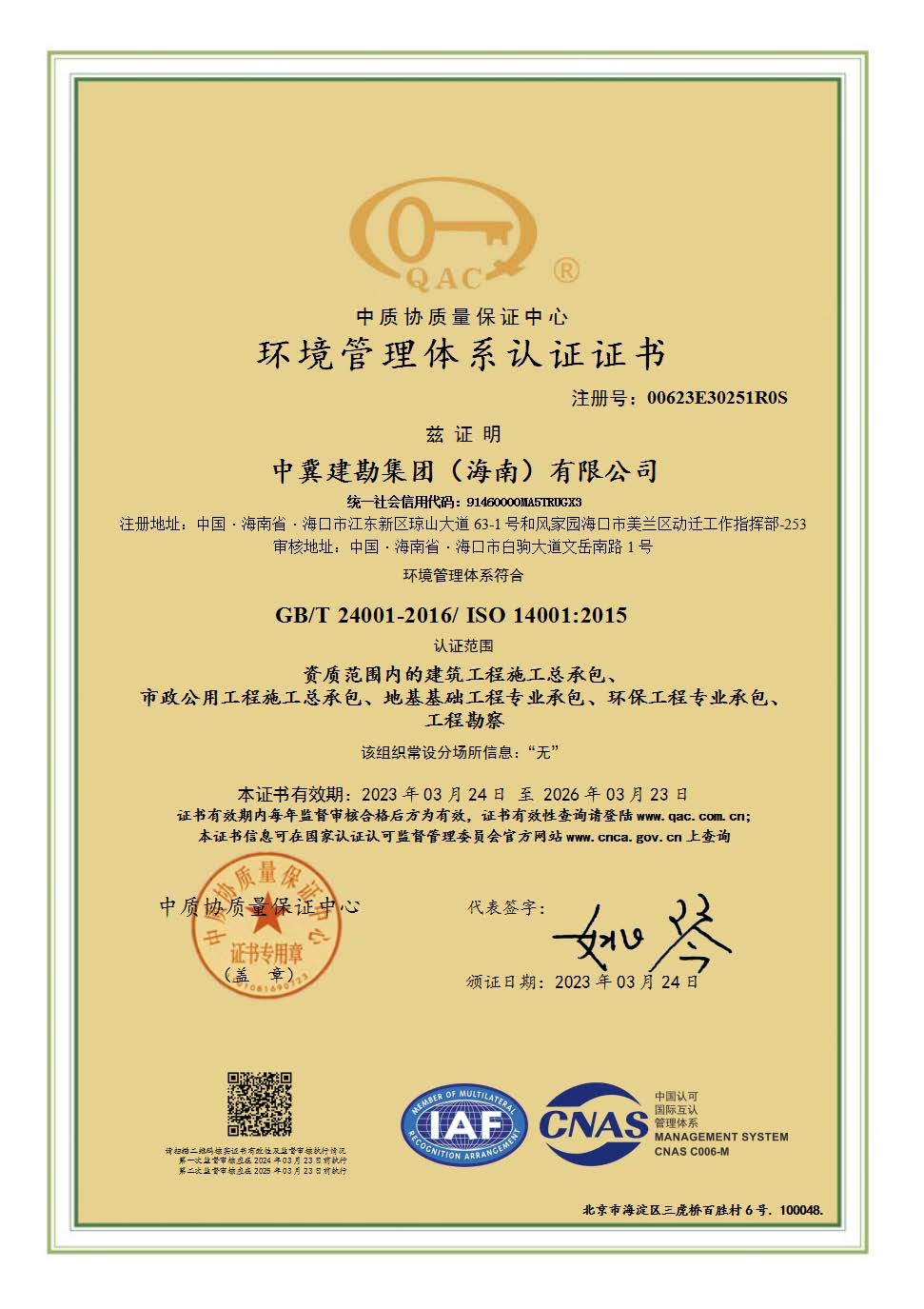 本次認證范圍覆蓋了中冀建勘集團(海南)有限公司現有的建筑工程施工總承包、市政公用工程施工總承包、地基基礎工程專業承包、環保工程專業承包及工程勘察資質。這標志著質量管理體系(GB/T19001-2016)、環境管理體系(GB/T24001-2016)、職業健康安全管理體系(GB/T45001-2020)在中冀建勘集團(海南)有限公司有效貫徹運行。