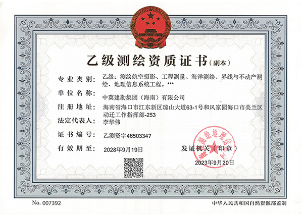 在集團(tuán)公司領(lǐng)導(dǎo)的正確領(lǐng)導(dǎo)下,經(jīng)過工程測(cè)量公司和安全生產(chǎn)部的精心運(yùn)作,中冀建勘集團(tuán)(海南)有限公司于2023年9月20日取得了海南測(cè)繪地理信息局頒發(fā)的測(cè)繪乙級(jí)資質(zhì),資質(zhì)包含五個(gè)專業(yè):測(cè)繪航空攝影、工程測(cè)量、海洋測(cè)繪、界線與不動(dòng)產(chǎn)測(cè)繪、地理信息系統(tǒng)工程。