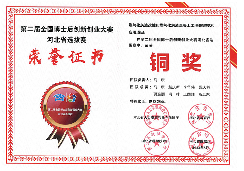 經公司組織,石家莊市人力資源和社會保障局推薦,河北省人力資源和社會保障廳、河北省教育廳、河北省科學技術廳、河北省財政廳組織評審,公司博士后科研人員馬康、張海清研究的課題分別榮獲第二屆全國博士后創新創業大賽河北省選拔賽銅獎、優勝獎。
