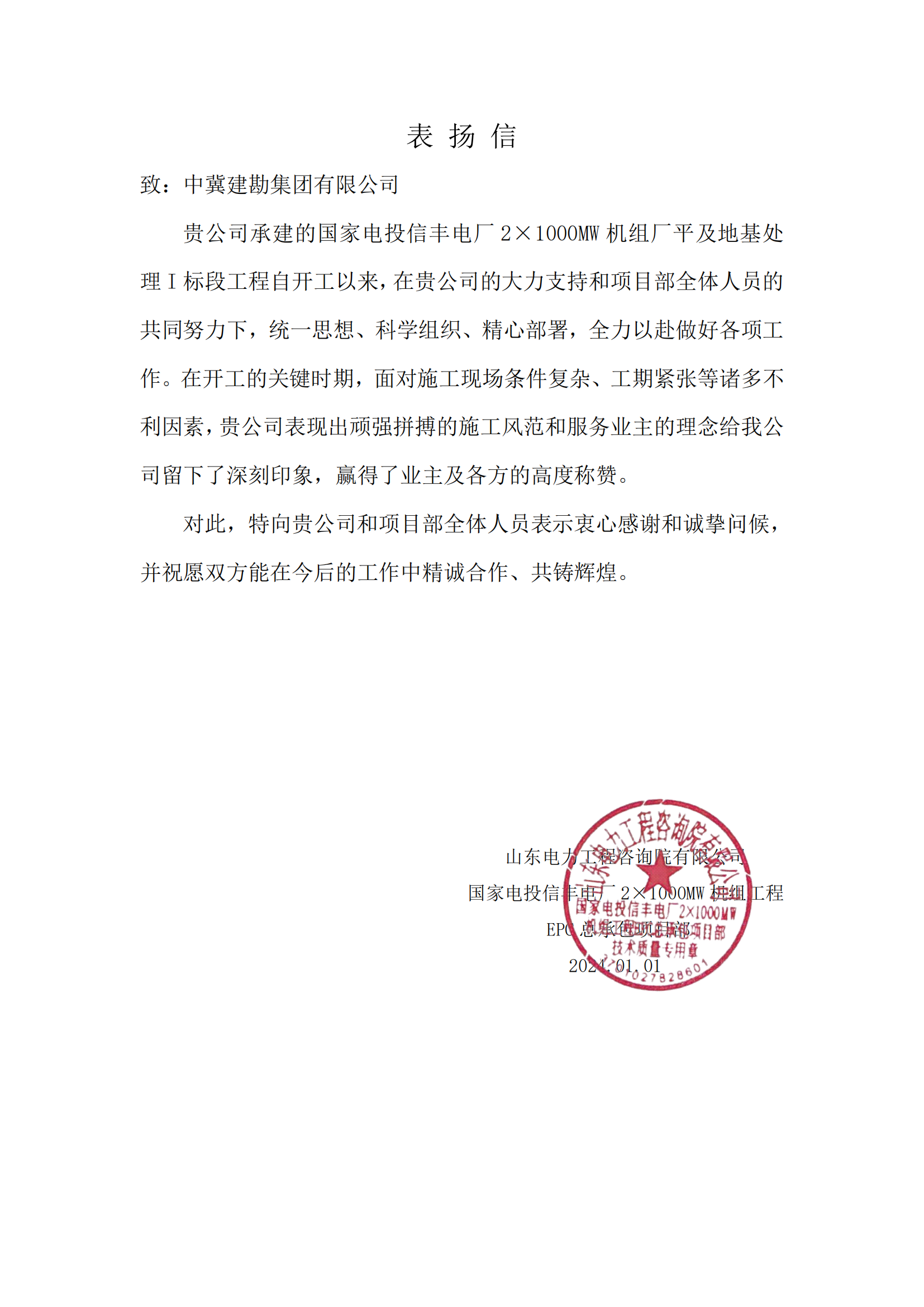 公司收到了國家電網慶陽±800千伏換流站工程由業主國家電網和監理單位河南立新及甘肅光明的聯合表揚信,表揚信中說在我公司領導的高度重視及項目部全體成員的共同努力下,高標準、高質量地完成施工任務,為后續土建單位施工奠定良好基礎,贏得了業主、監理單位的一致認可。在施工的關鍵時期,我單位項目部全體成員迎難而上,精誠協作,砥礪前行,在風雪中有建勘人不屈的脊梁,將建勘人的鐵軍精神發揮的淋漓盡致!