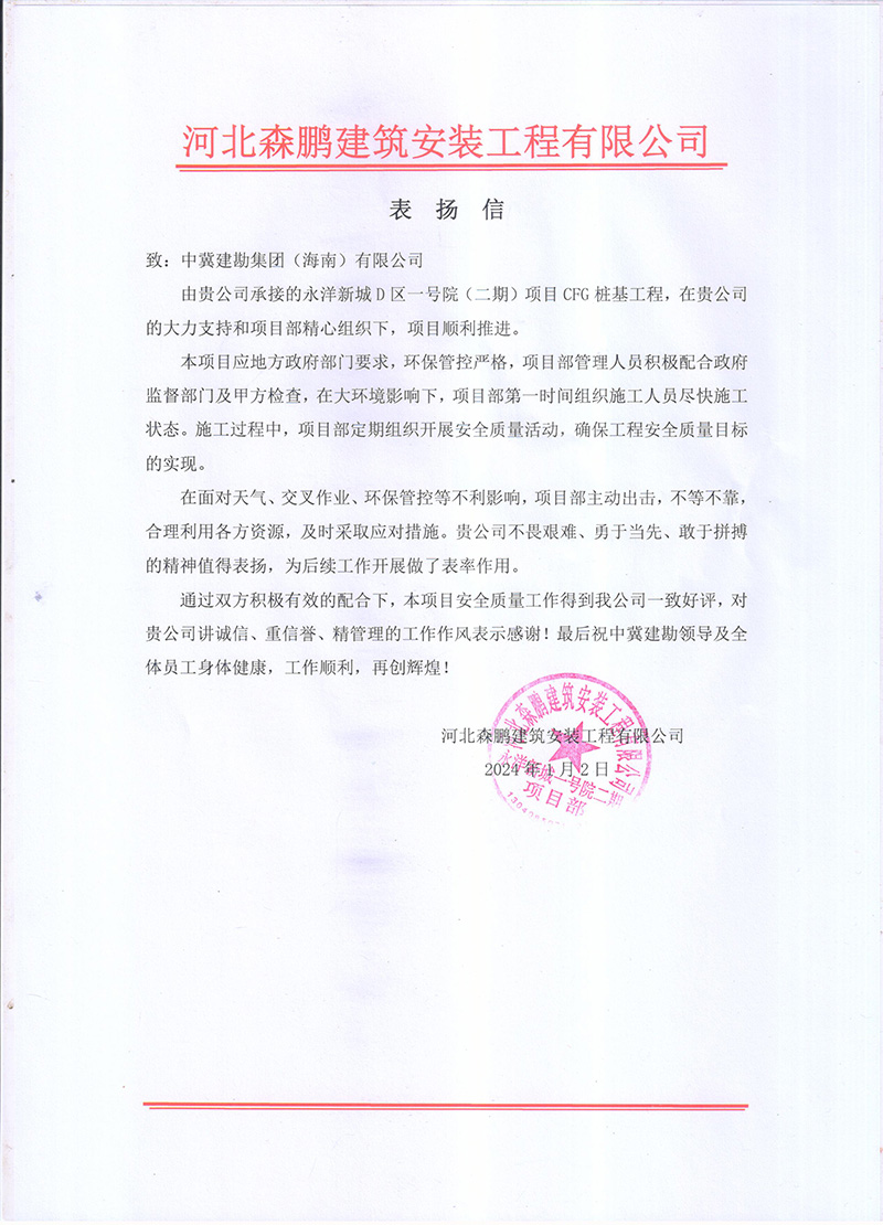 連云港榮泰化工倉儲有限公司倉儲罐區工程(五期)項目二標段樁基工程,業主在表揚信中說:貴公司克服工程建設中面臨的場地緊張、疫情嚴、任務繁重等諸多困難,安全、高效、優質的圓滿完成了施工任務。貴公司項目部全體員工克服重重困難,精心謀劃,精心施工。特別是在施工中所表現出的管理水平及敬業精神,令人欽佩。