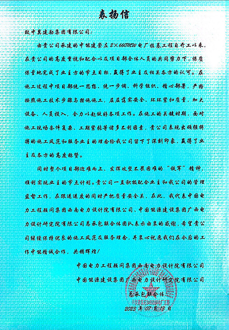 華電龍口發電有限公司四期項目2號機組于2023年12月17日20時04分順利完成168小時滿負荷試運行。工程建設期間,完成了各項安健環活動,并在安全管理方面取得良好的效果,贏得了業主方認可。我公司人員嚴格遵守我公司規章制度,急業主之所急,想業主之所想,統籌協調資源,展現了良好的精神風貌、履約能力、企業品牌形象。為此,業主特向我公司各級領導、項目團隊在工程施工過程中給予的支持和幫助表示由衷感謝。