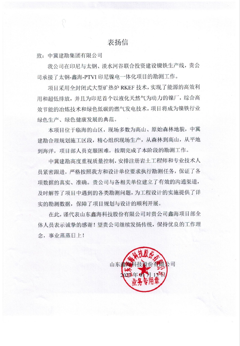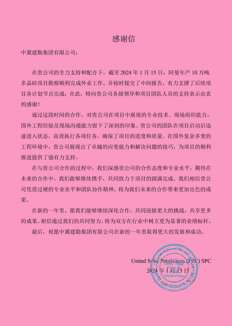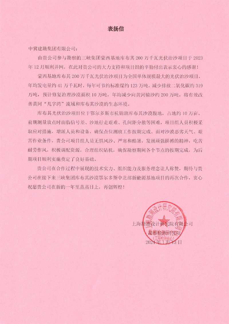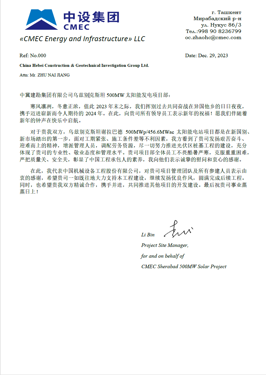 中國機械設(shè)備工程股份有限公司發(fā)來的表揚信,對在烏茲別克斯坦謝拉巴德 500MWp/456.6MWac 太陽能電站項目建設(shè)過程中,項目全體人員克服諸多不利因素,發(fā)揚建勘精神,盡一切努力推進工程建設(shè),以及公司的專業(yè)性、敬業(yè)態(tài)度和管理水平給予了高度評價。同時,對項目管理團隊及所有參建人員表示由衷的感謝,并希望雙方精誠合作,攜手并進,共同推進其他項目的開發(fā)建設(shè)。