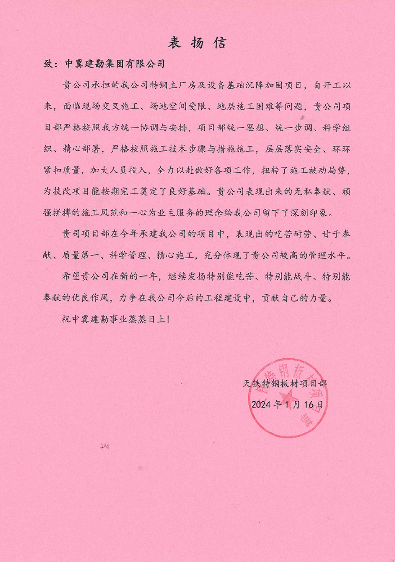 近日,集團公司陸續(xù)收到國內(nèi)外項目業(yè)主發(fā)來的表揚信,信中對我公司的項目管理、團隊建設(shè)、安全文明施工、技術(shù)質(zhì)量管控等,給予了高度評價,同時送上了新年一年的祝福。