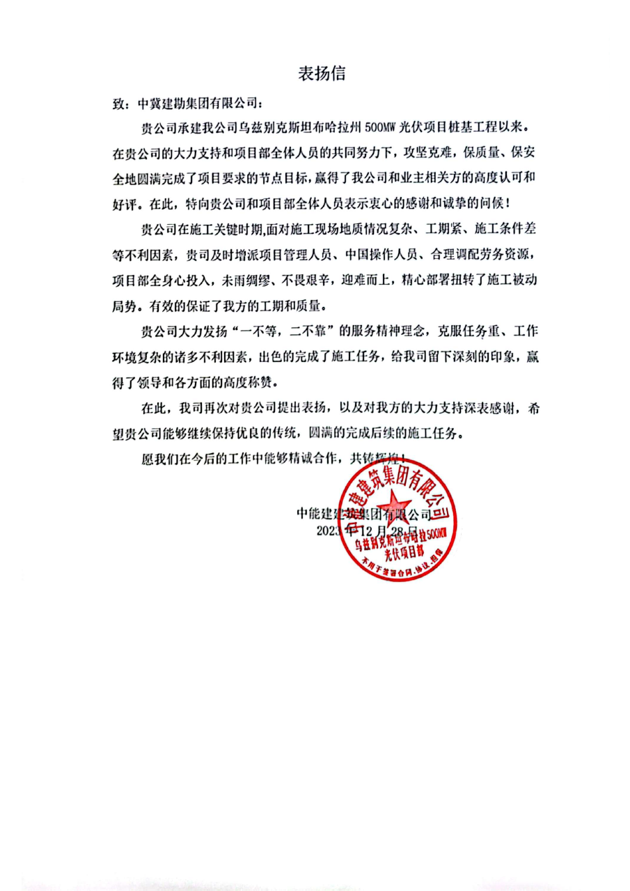中能建建筑集團有限公司發(fā)來的表揚信,對在烏茲別克斯坦布哈拉州500MW光伏項目建設(shè)過程中,項目部全體人員發(fā)揚“一不等,二不靠”的服務理念,克服工作環(huán)境和地質(zhì)復雜等困難,在公司的大力支持和項目全體人員的共同努力下,圓滿完成了項目要求的節(jié)點目標,特向我公司表示衷心的感謝和誠摯的問候,愿今后繼續(xù)精誠合作,共鑄輝煌。