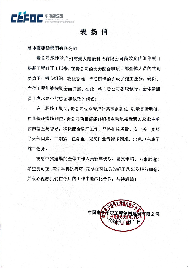 中國電子系統(tǒng)工程第四建設(shè)有限公司發(fā)來的表揚信,對我公司在廣州高景太陽能科技有限公司高效光伏組件項目建設(shè)過程中,公司的大力配合和項目部全體人員的共同努力下,安全管理體系覆蓋到位,質(zhì)量保證措施到位,嚴格把控質(zhì)量、安全關(guān),出色完成了施工任務,特向我公司各級領(lǐng)導、全體參建員工表示衷心的感謝,并授予“優(yōu)秀安全管理團隊”和“優(yōu)秀資料包商”榮譽。