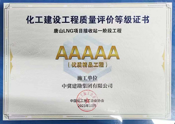 唐山LNG項目接收站一階段工程榮獲化工行業(yè)“AAAAA優(yōu)質(zhì)精品工程”