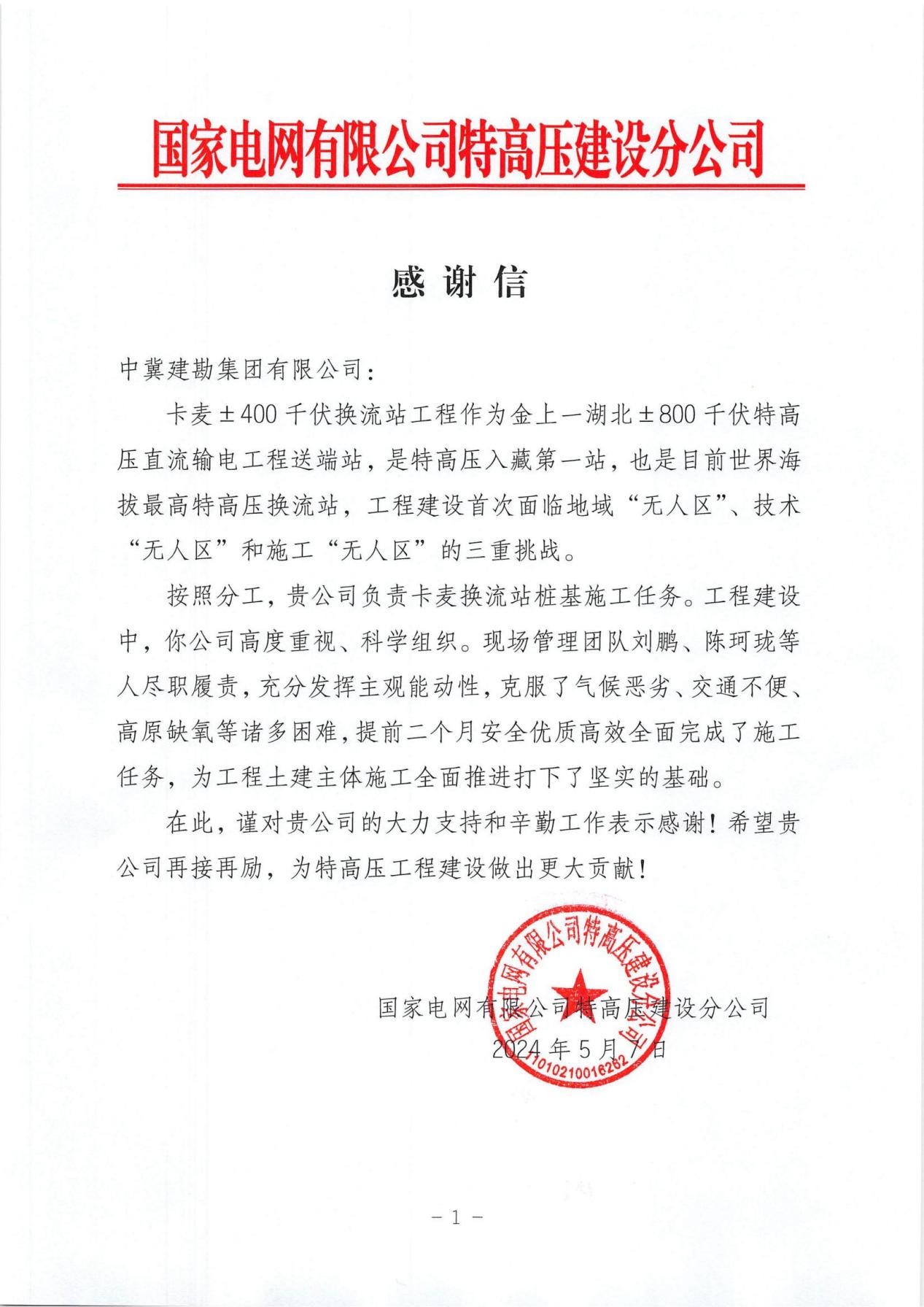 同時,業主及監理給予了極高的贊譽與肯定,授予了我公司“優秀承包商”的榮譽稱號;授予劉鵬同志“優秀項目經理”榮譽稱號;陳珂瓏同志“優秀項目總工”榮譽稱號;紀曉蒙同志“優秀項目副經理”榮譽稱號;李鑫同志“優秀安全總監”榮譽稱號;張和平同志“優秀項目質檢員”榮譽稱號;魏耀文同志“優秀項目技術員”榮譽稱號;張博杰同志“優秀項目技術員”榮譽稱號;王美兵同志“優秀項目施工員”榮譽稱號。此外,針對項目部在卡麥換流站做出的突出貢獻,國網特高壓分公司特意撰寫了一份感謝信,對于我公司的施工履約能力給予肯定和感謝,期待后續工程繼續合作,再創佳績!