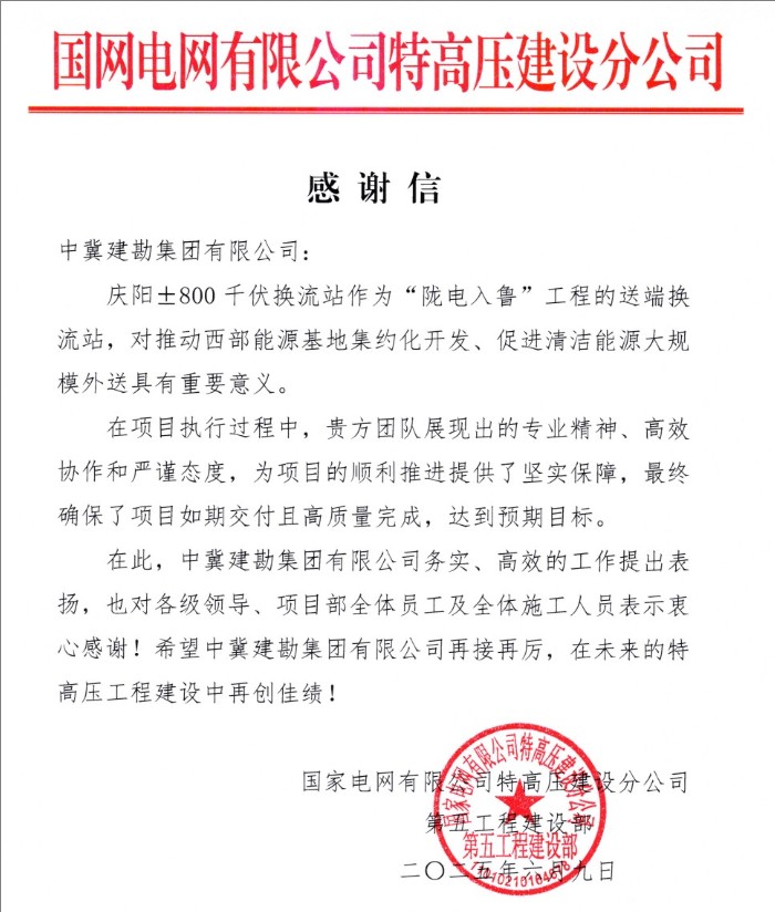 2025年6月9日,在±800千伏隴東-山東特高壓直流工程(簡稱“隴電入魯”)正式投運之際,我公司收到國家電網(wǎng)有限公司特高壓建設(shè)分公司對慶陽±800千伏換流站項目發(fā)來的感謝信。信中高度贊揚了我公司在項目執(zhí)行過程中展現(xiàn)出的卓越專業(yè)精神、高效協(xié)作能力和嚴謹工作態(tài)度。
