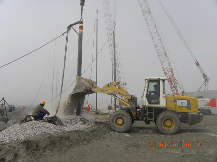 儲罐振沖碎石樁工作量:碎石樁每罐基礎1519根,共6076根,樁徑1300㎜/1200㎜,樁長30m,總方量318512m3。