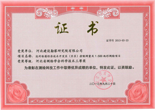 近日,由工程測量公司完成的滄州臨港經濟技術開發區(東區)控制測量及1:500地形測繪項目,被河北省測繪學會評為河北省測繪學會科學技術三等獎。
